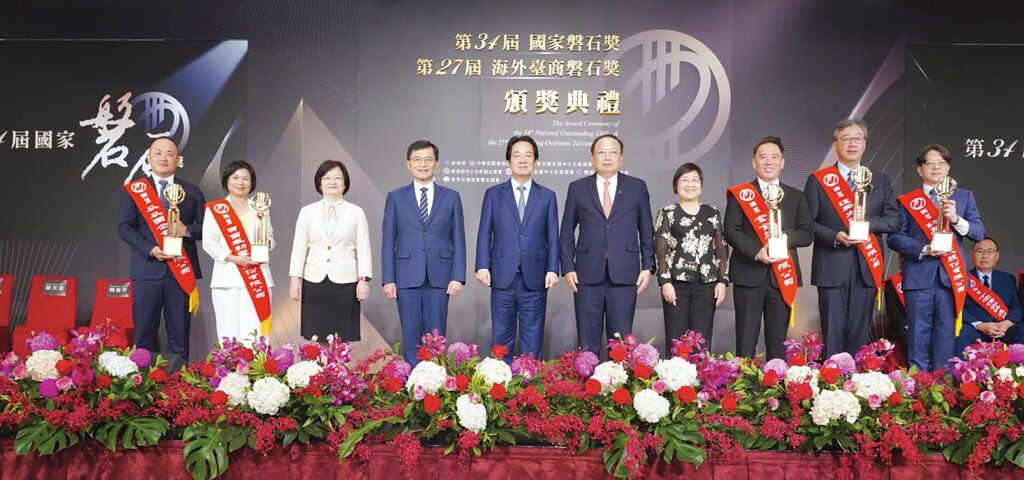 第34屆國家磐石獎頒獎典禮,賴清德總統、經濟部何晉滄次長(左4)、僑務委員會徐佳青委員長(右4)、中華民國全國中小企業總會李育家理事長(右5)與得主代表企業合影。圖/經濟部中小及新創企業署提供