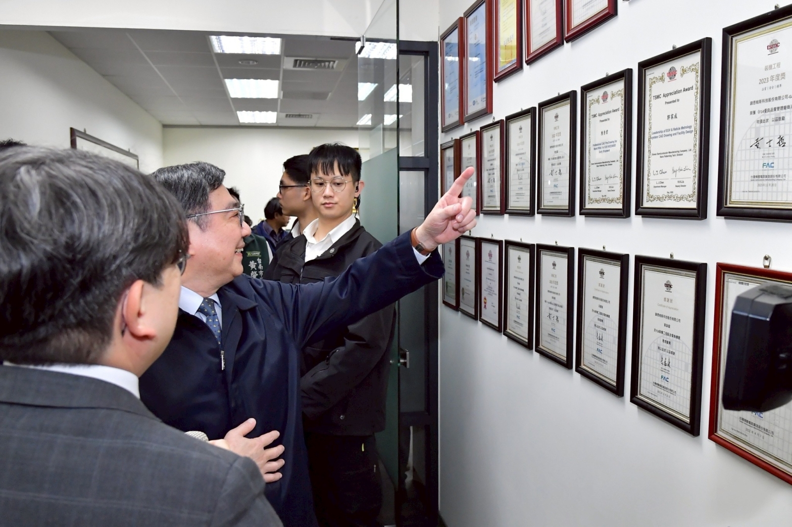 致詞結束後,卓院長偕同行政院發言人李慧芝、雲嘉南區聯合服務中心執行長劉米山、經濟部次長何晉滄、中小及新創企業署署長李冠志,以及臺南市副市長葉澤山等貴賓,在陳董事長的親自導覽下,參觀公司榮譽牆、國家磐石獎紀念區、ESG獲獎成果及成品展示區。